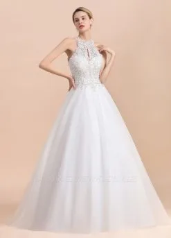 Gorgeous Halter Rhinstones Wedding Dress White Lace Appliques Tulle Garden Bridal Gowna