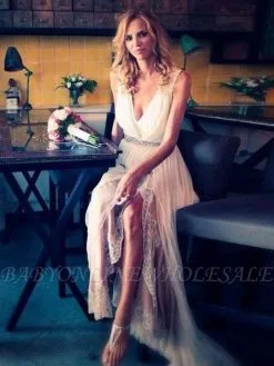 A-Line Sleeveless V-neck Sweep Train Chiffon Beading Wedding Dresses