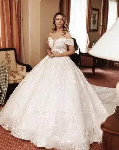 Stunning Off Shoulder V-Neck Tulle Lace Appliques Wedding Dress Aline Bridal Dress