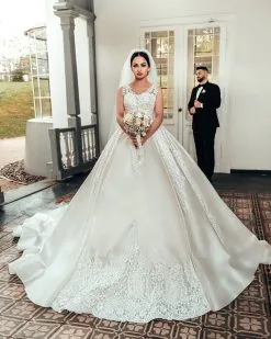 Chic White 3D Floral Lace Pricness Wedding Gown Cathedral Train