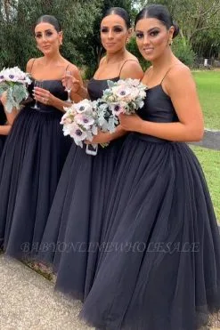 Elegant Black Spaghetti Straps Floor Length Scoop Neckline Bridesmaid Dresses | A-line Long Prom Dress Wedding Party Dresses
