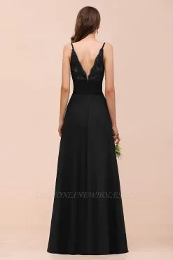 Charming Deep V-Neck Black Bridesmaid Dress With Side Slit With Spaghetti Straps