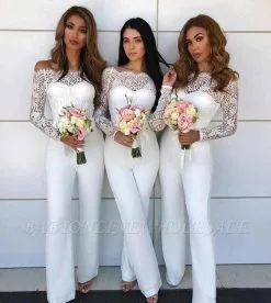 Off Shoulder Lace Jumpsuit Bridesmaid Dresses | Long Sleeves Sheath Wedding Party Pants
