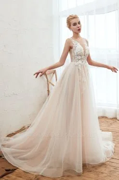 Illsuion Neck Champange Wedding Dress With Chapel Train | Sleeveless Summer Bridal Gowns Online