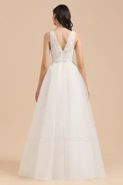 Ivory V-Neck Tulle Lace Appliques Simple Wedding Dress Garden Wedding Gowns Floor Length