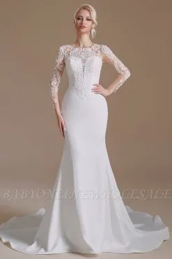 Long Sleeves Wedding Dress Mermaid White Crew Neck Floral Lace Long Bridal Dress