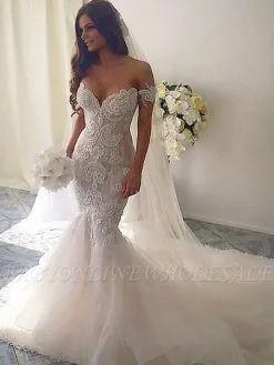 Off-the-Shoulder Tulle Beach Wedding Dress Sweetheart Lace Mermaid Bridal Dress