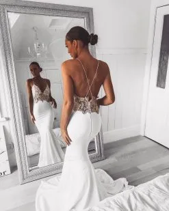 Sexy V-Neck Lace Spaghetti Strap Mermaid Wedding Dress Open Back Bridal Gown