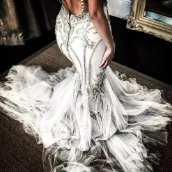 V-Neck Backless Mermaid Wedding Dress Tulle Lace Appliques Long Bridal Dress