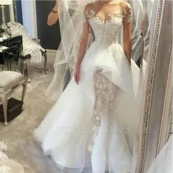 Wholesale Fit And Flare Tulle Lace Wedding Dresses | Short Sleeves Court Train Bridal Gown