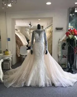 Elegant Collar Long Sleeve Floral Pattern Mermaid Wedding Dress Detachable Sweep Train