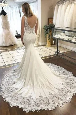 Elegant V-Neck Appliques Wedding Dresses | Sleeveless Backless Mermaid Floral Bridal Gowns