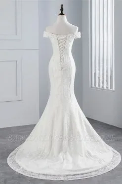 Elegant Off Shoulder White Lace Mermaid Wedding Gown With Floral Appliques