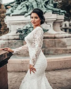 Elegant White Floral Lace Mermaid Spring Wedding Dress Long Sleeves V-Neck Slim Bridal Dresses