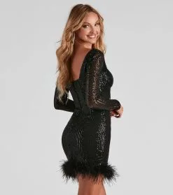 Windsor. Jayla Long Sleeve Sequin Feather Mini Dress