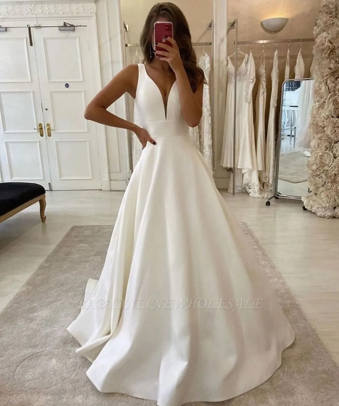 Babyonlinewholesale offers A-line Wedding Dress Double V-Neck Bridal Gowns at a good price from Same as Picture,White,Ivory,Blushing Pink,Pearl Pink,Dusty Rose,Red,Fuchsia,Burgundy,Gold,Champagne,Daffodil,Lilac,Lavender,Pool,Ocean Blue,Royal Blue,Dark Navy,Black,Silver,Dark Green,Jade,Green,Sage,Mint Green,Satin to A-line Floor-length them. Stunning yet affordable Sleeveless
