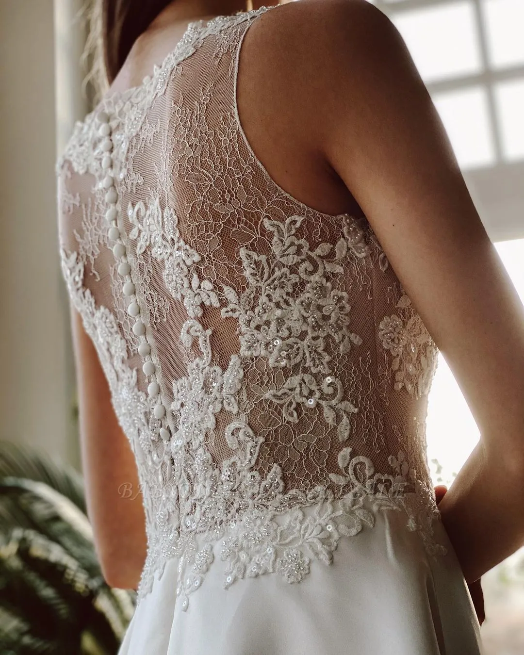 Aline Wedding Dress Sleeveless V-Neck Satin Bridal Dress With Floral Lace Pattern
