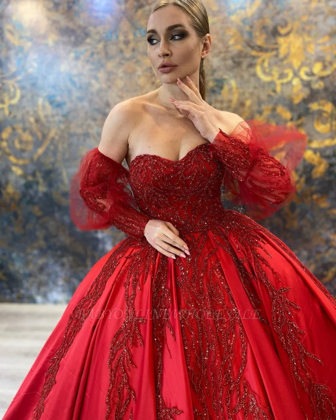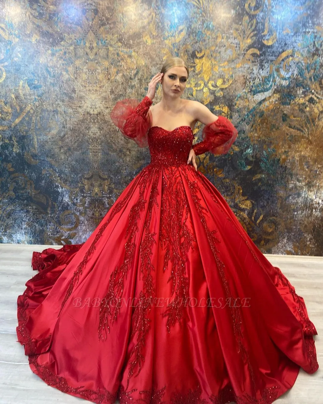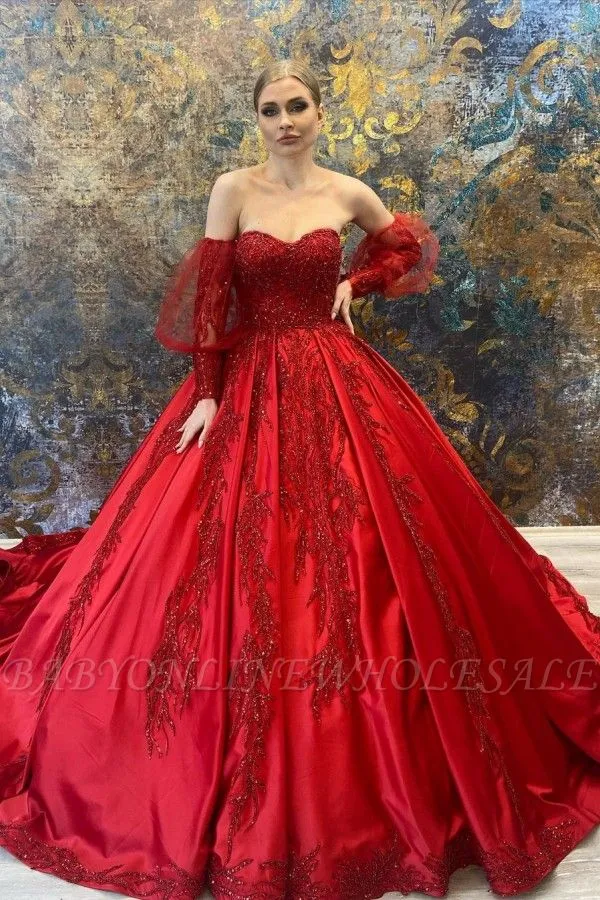 Looking for in Satin, Princess style, and elegant Lace work? Babyonlinewholesale has all covered on this unique Amazing Red Sweetheart Sleeves Ball Gown with Floral Appliques.