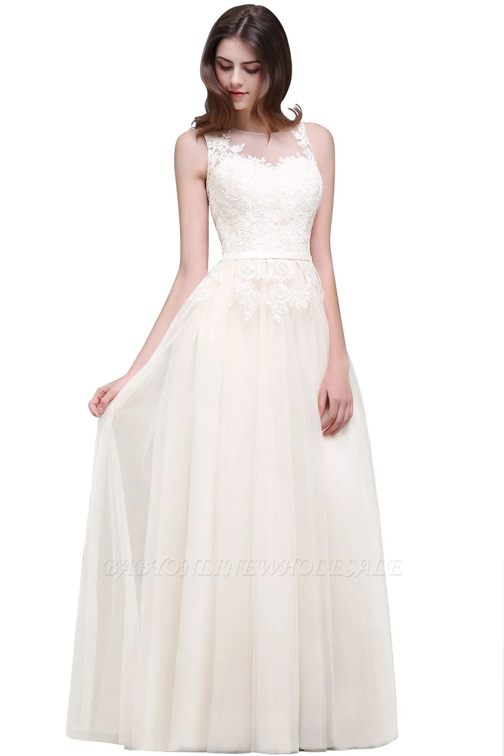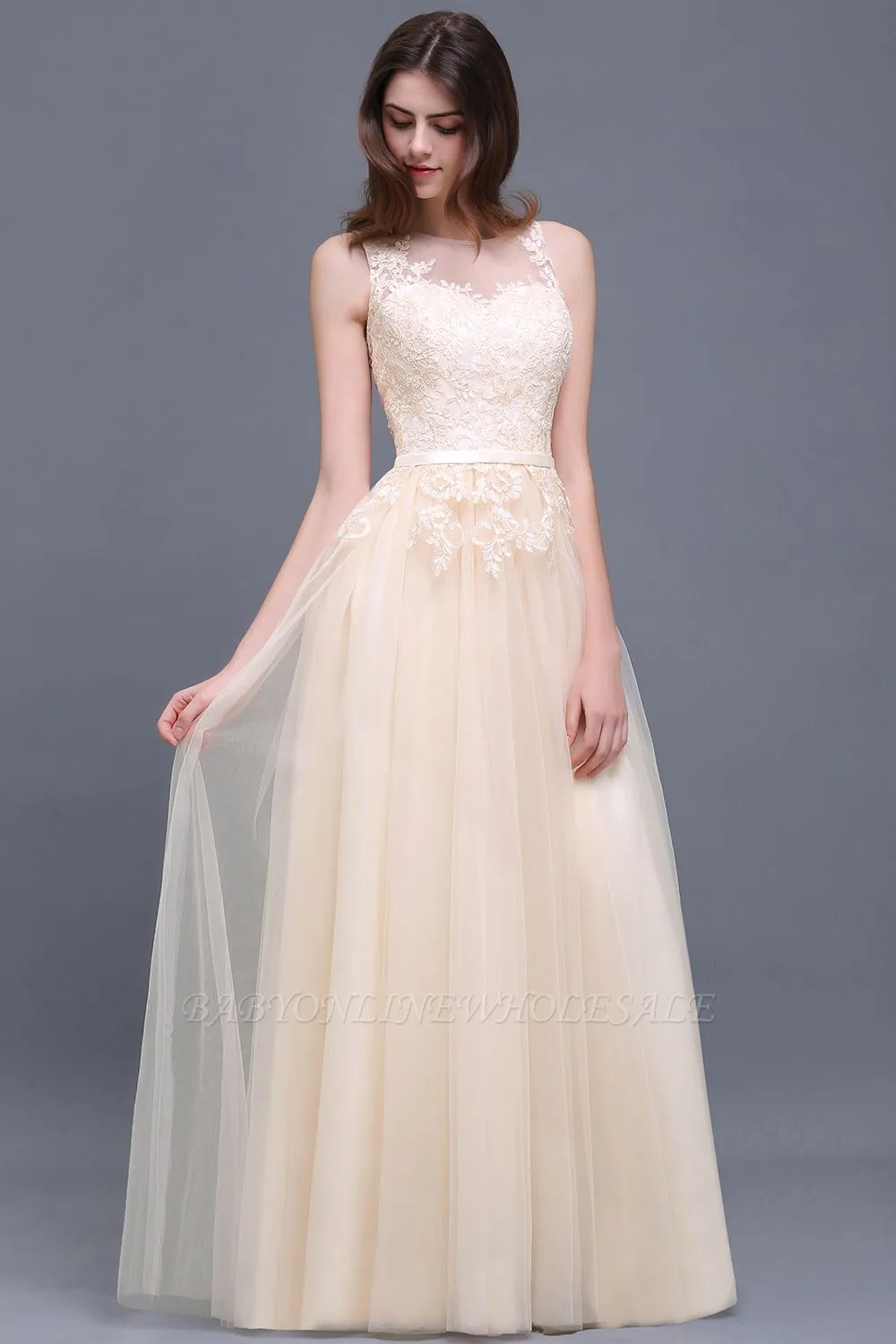 Shop Babyonlinewholesale US for modest ATHENA | A-line Floor-Length Tulle Prom Dress With Lace. Find the perfect Ivory,Dusty Rose,Burgundy,Royal Blue,Dark Navy,Light Champagne bridesmaid dress, cheap Sleeveless Tulle gowns online, Floor-length dresses for wedding party.