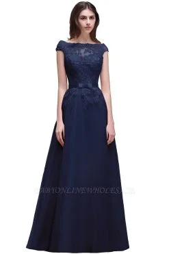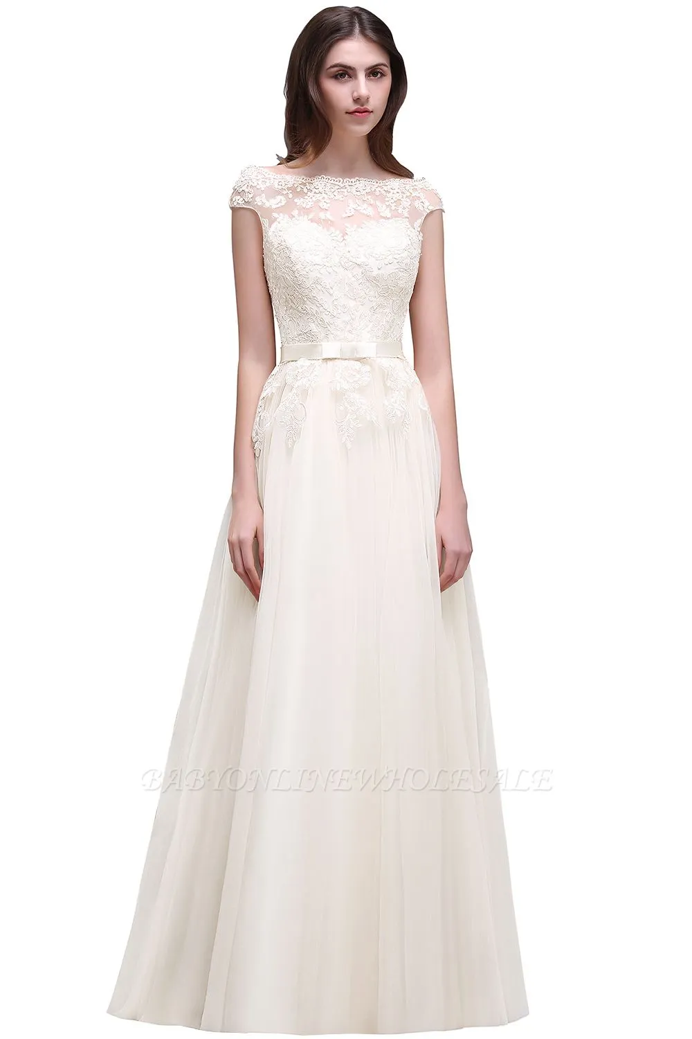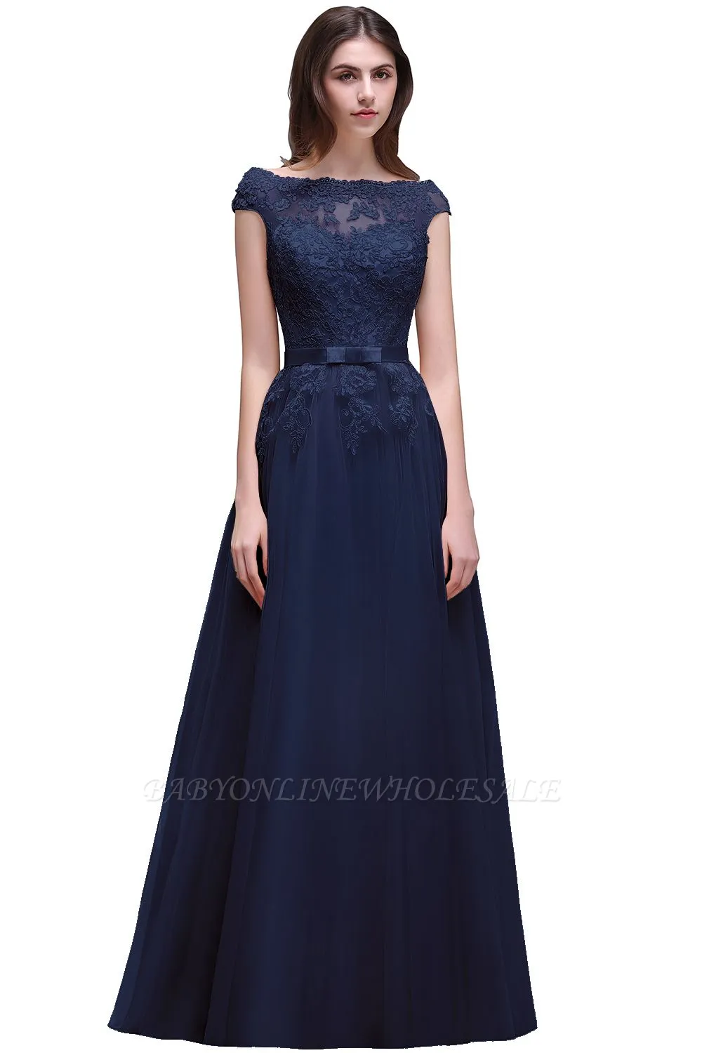 Shop Babyonlinewholesale US for modest AUBREE | A-line Floor-Length Tulle Prom Dress With Lace Appliques. Find the perfect Ivory,Dusty Rose,Burgundy,Royal Blue,Dark Navy,Black,Light Champagne bridesmaid dress, cheap Short Sleeves Tulle,Lace gowns online, Floor-length dresses for wedding party.