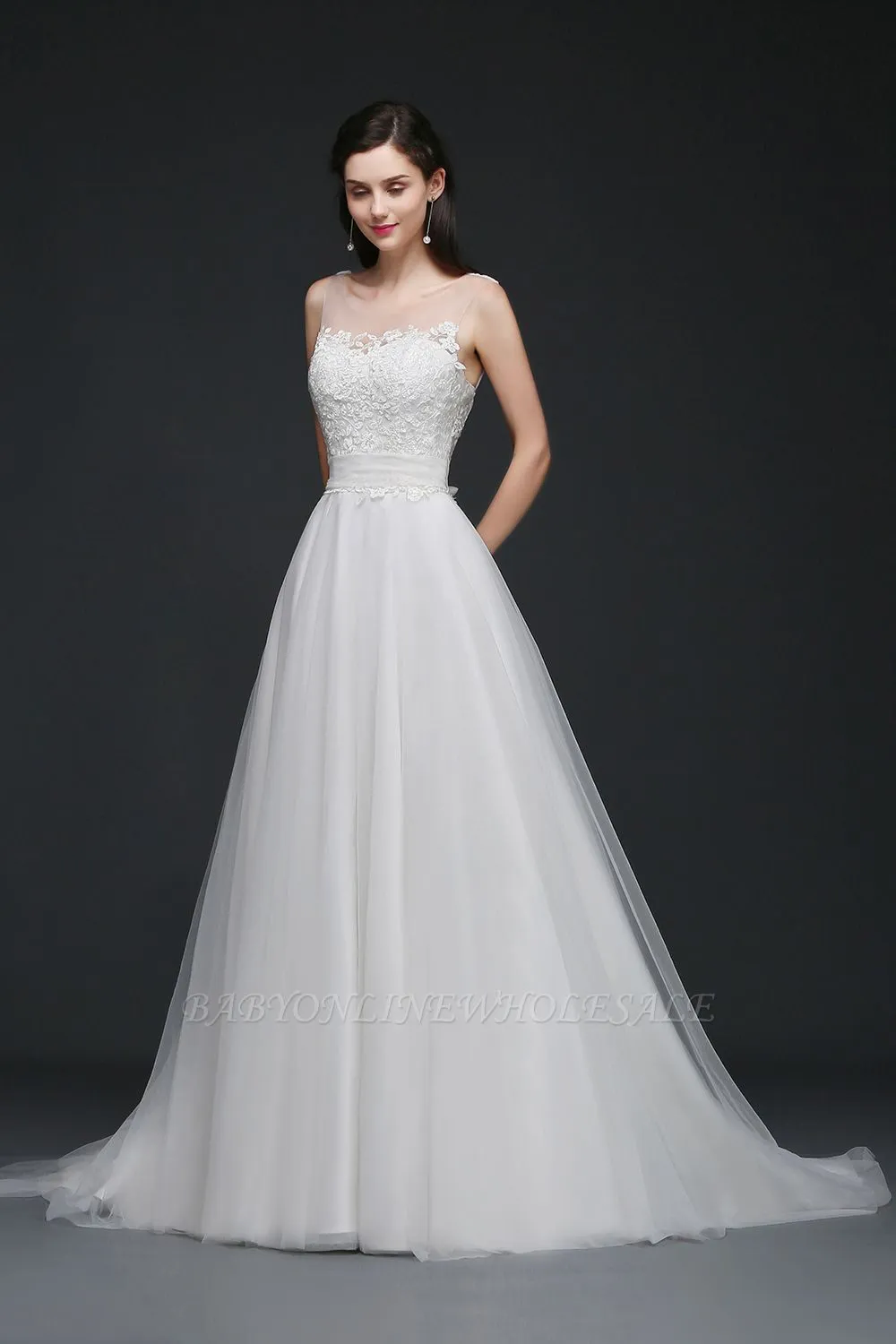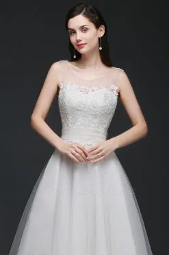 A-Line Applique Court Train Sleeveless Tulle Scoop Wedding Dresses