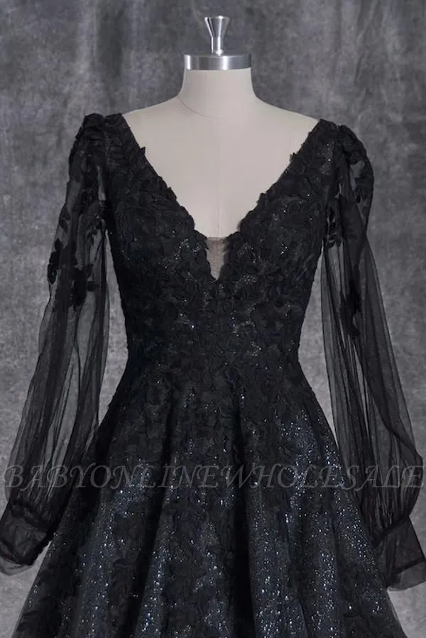 | product name | Black long sleeves v-neck a-line wedding dress |