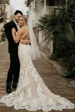 Spaghetti Straps Simple Wedding Dress With Layers Tulle Lace Appliques
