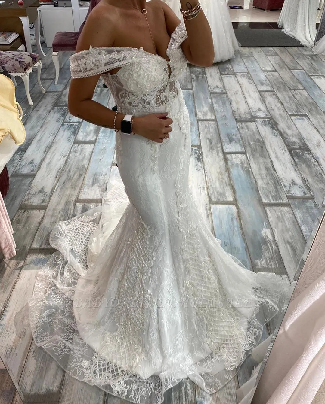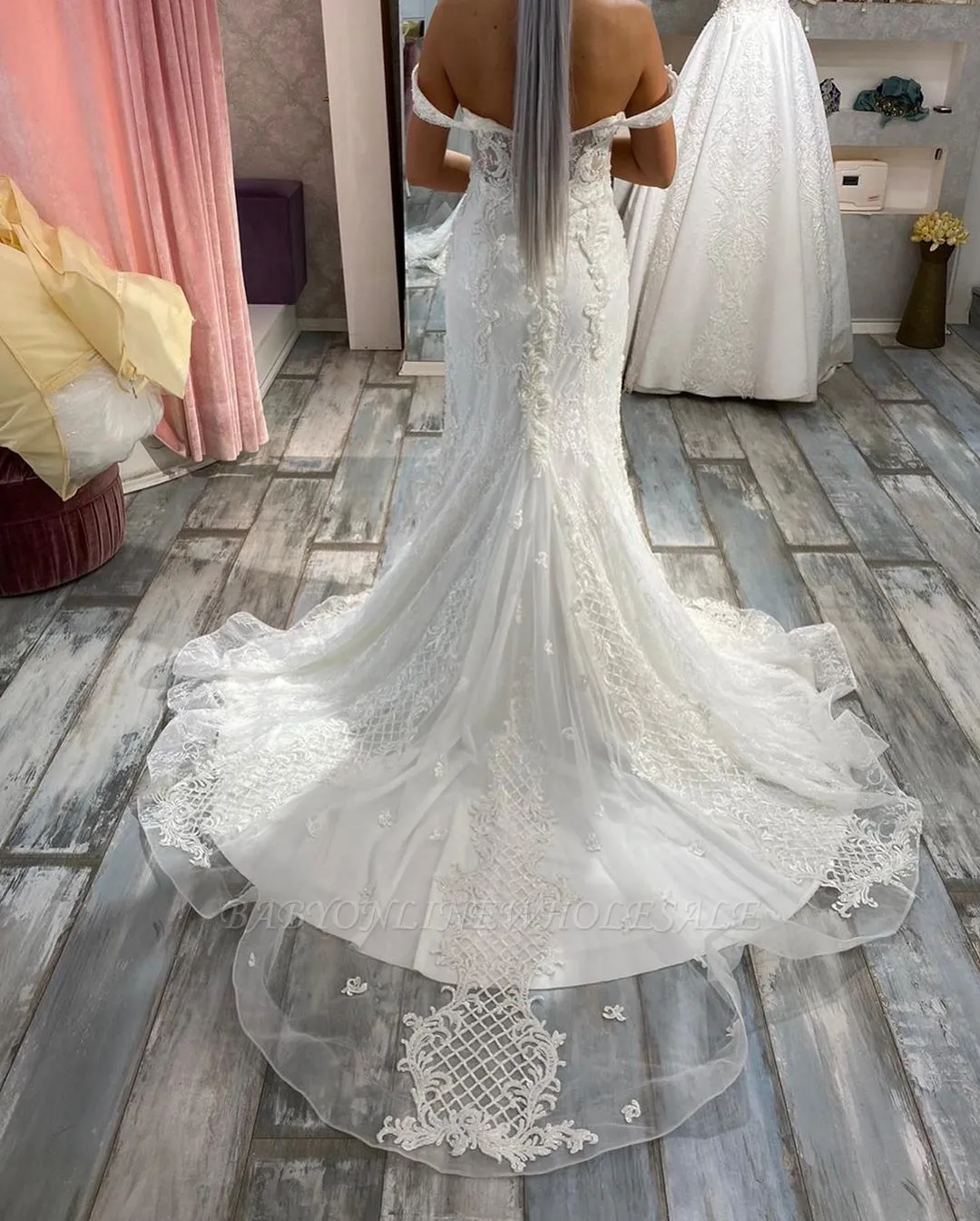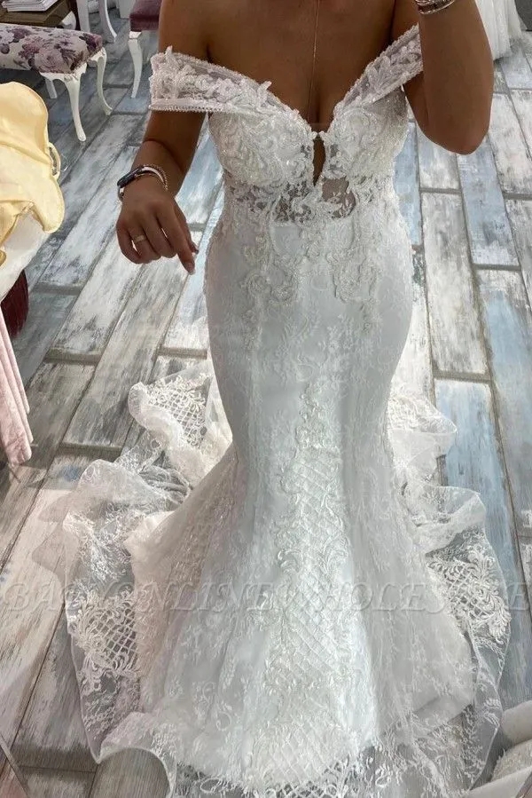 | product name | Boho Off Shoulder White Tulle Lace Mermaid Bridal Dress |