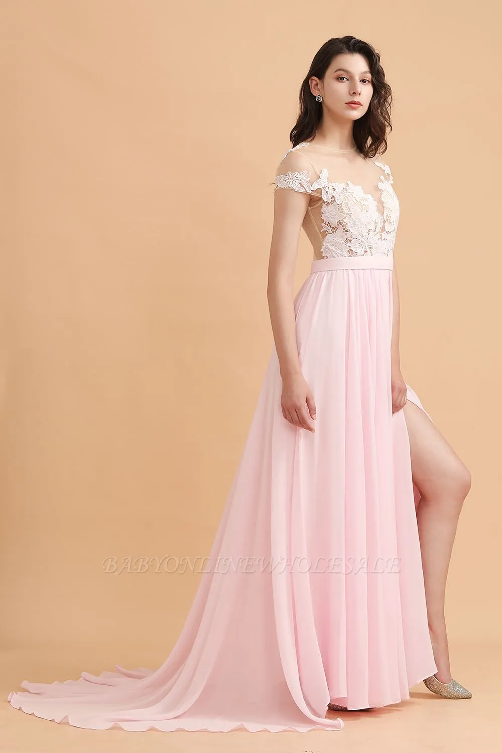 Babyonlinewholesale offers Cap Sleeves Lace Appliques Bridesmaid Dress Pink Chiffon Aline Wedding Party Dress with Side Slit online at an affordable price from 100D Chiffon to A-line Hi-Lo skirts. Shop for gorgeous Half-Sleeves Bridesmaid Dresses collections for your big day.
