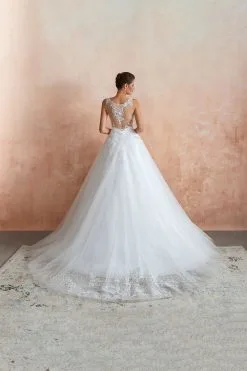 | product name | Carly, Sexy Pluging V-neck Ball Gown Wedding Dress with Chapel Train, Affordable Bridal Gowns with see-through Lace Back |