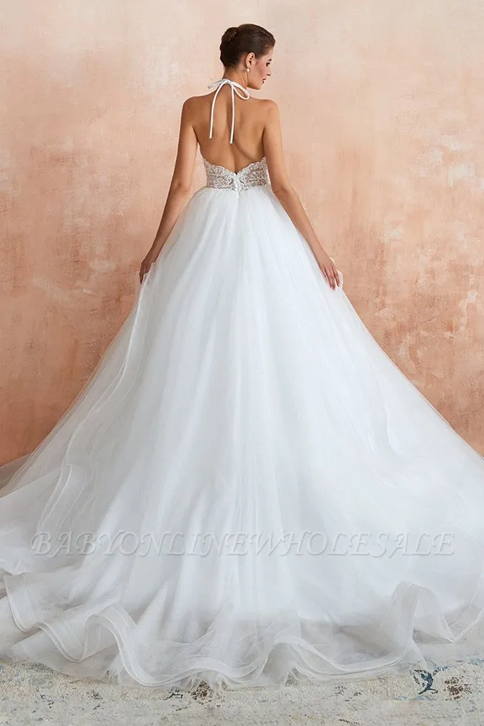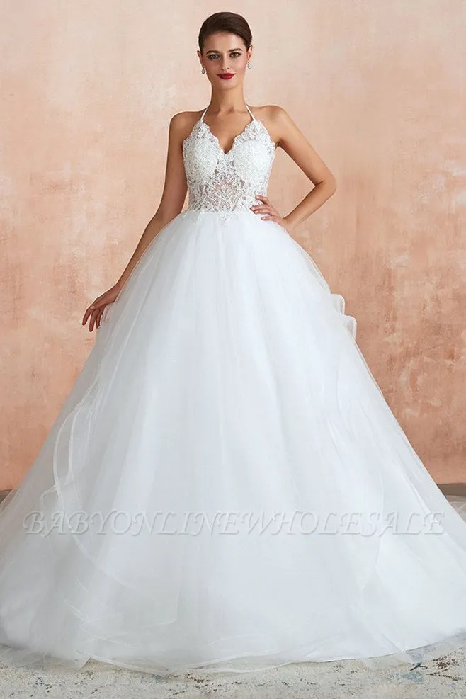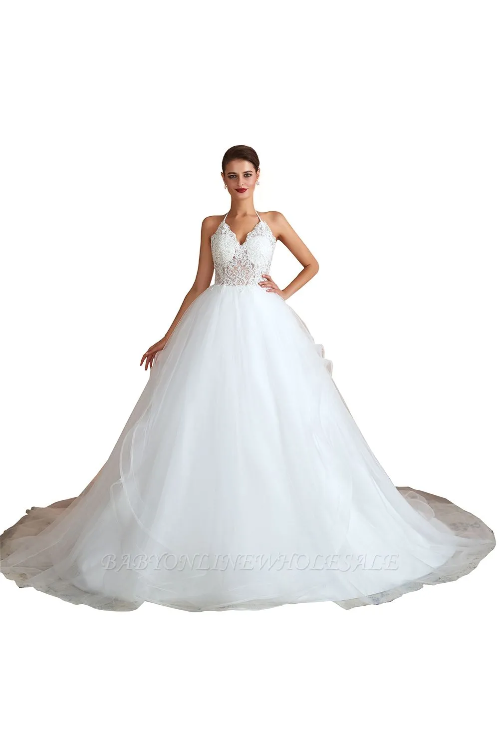 Babyonlinewholesale has Carmen | Simple Halter Ball Gown Wedding Dress with Chapel Train, Open Back V-neck Lace Bridal Gowns For Summer/Fall Wedding in every style and size you could possibly imagine, which makes picking out the perfect dress for you easily!