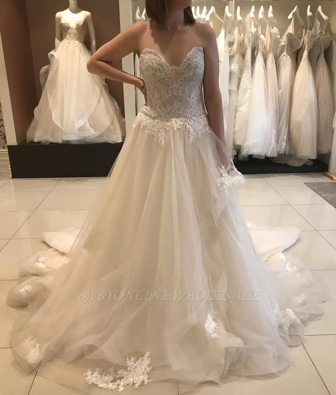 Looking for in Tulle,Lace, A-line style,and Gorgeous Lace work. We have all covered on this Casual Chapel Train Sweetheart Princess Lace Wedding Dress with Romantic Tulle Skirt design.