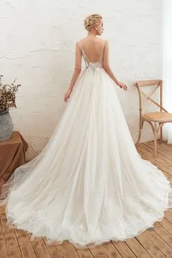 | product name | Champange Princess Tulle Wedding Dress with Soft Pleats, Sexy V-neck Low Back Bridal Gowns with Lace Appliques |