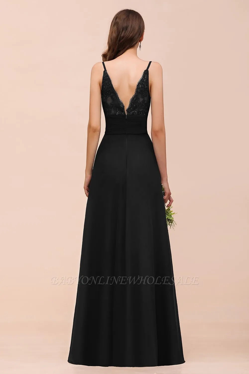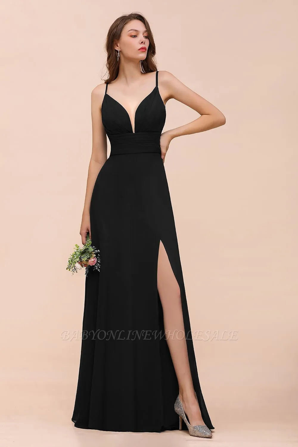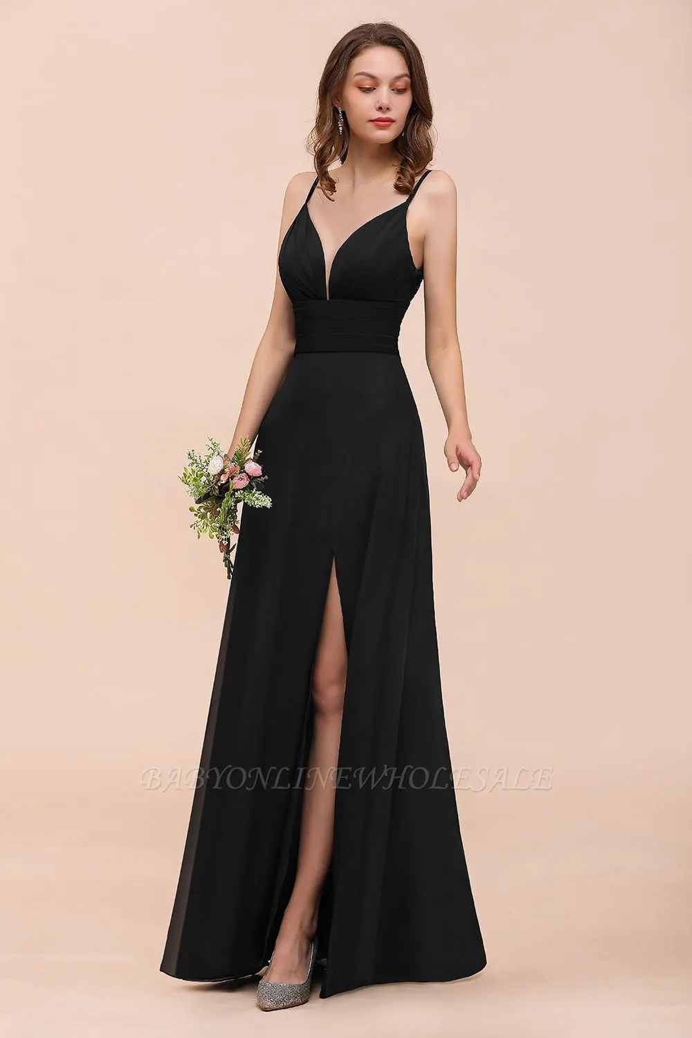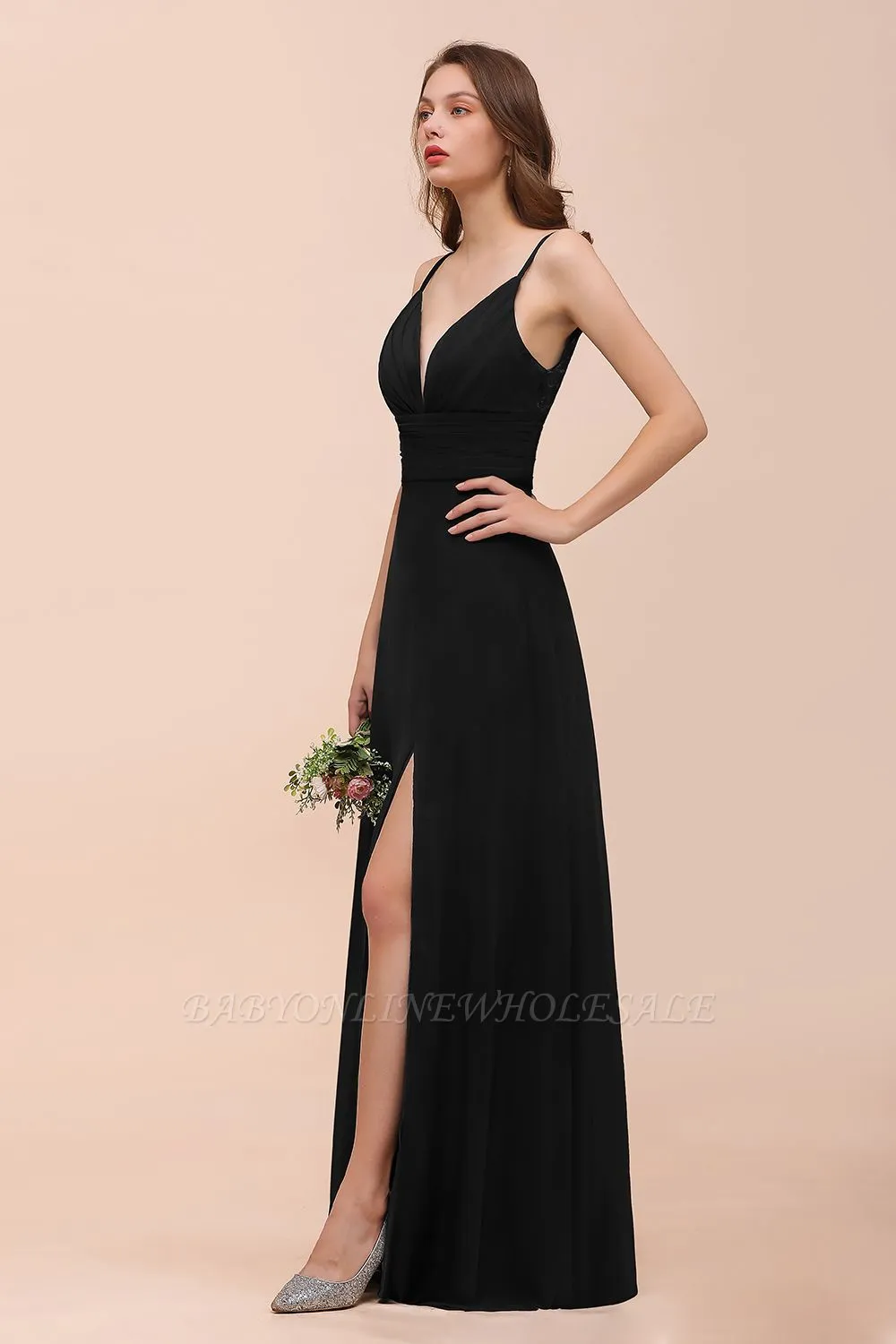 | product name | Charming Deep V-Neck Black Bridesmaid Dress with Side Slit with Spaghetti Straps |