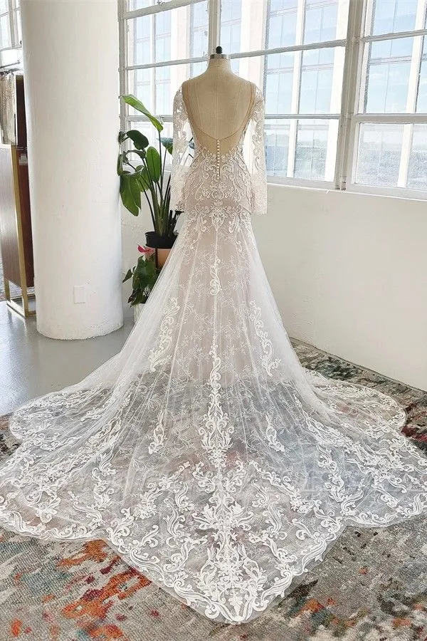 Charming V-neck Mermaid Long Sleeves A-Line Tulle Wedding Dress With Appliques