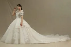Gorgeous Half Sleeves Satin Lace Appliques Ball Gown Wedding Dress