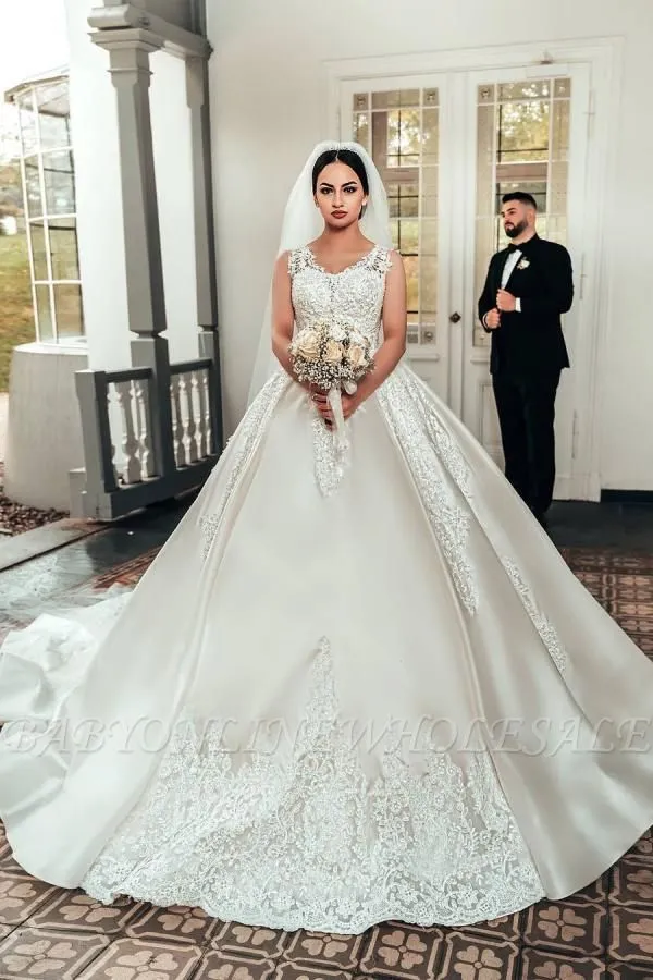 The gorgeous Chic White 3D Floral Lace Pricness Wedding Gown Cathedral Train will stun every girl. The Satin dress will add extra elegance to your wholesale look.