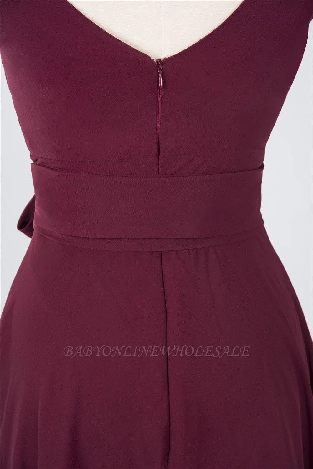 | product name | Chiffon A-Line Straps V-Neck Sleeveless Ruffles Short Bridesmaid Dress with Bow Sash |
