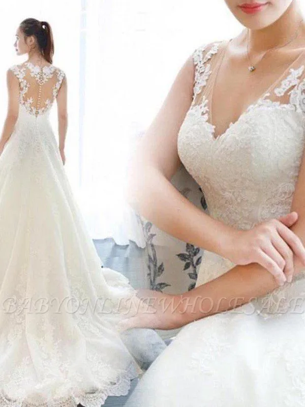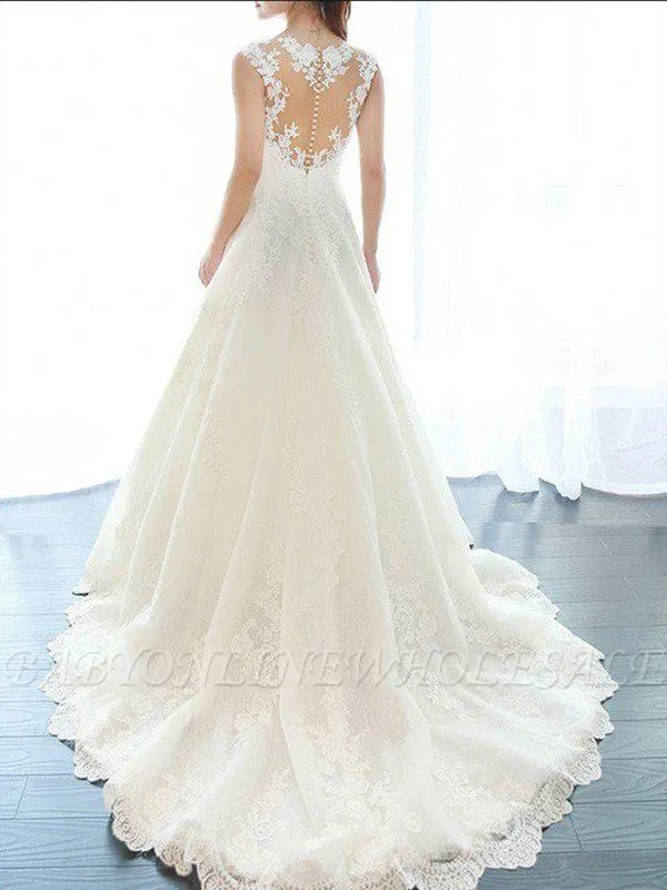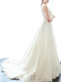 | product name | Court Train A-Line Lace V-neck Applique Sleeveless Wedding Dresses |