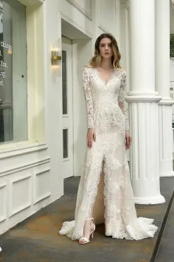 Be the first to review “Delicate V-Neck High Split Long Sleeves Lace Wedding Dress With Court Train” Cancel reply