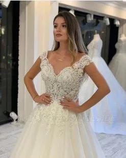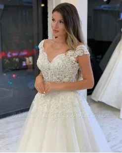 The gorgeous Elegant Aline Wedding Dress Floral Lace Off Shoulder ulle Bridal Dress will stun every girl. The Tulle dress will add extra elegance to your wholesale look.