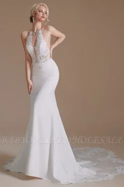 Looking for in Lace style, and dreamful work? Babyonlinewholesale has all covered on this fashion Elegant Deep V-Neck Floral Lace Mermaid Wedding Dress Sleeveles halter White Satin Bride Dress.
