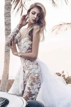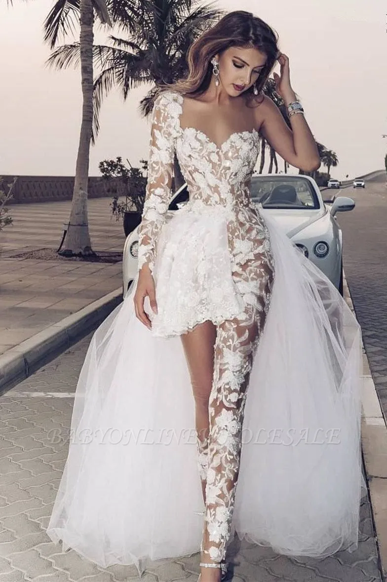 Babyonlinewholesale offers Elegant Lace Jumpsuit Asymmetirc See-through Overskirt White Wedding Dress online at an affordable price from Lace to Column Ankle-length skirts. Shop for gorgeous Long Sleeves collections for your big day.