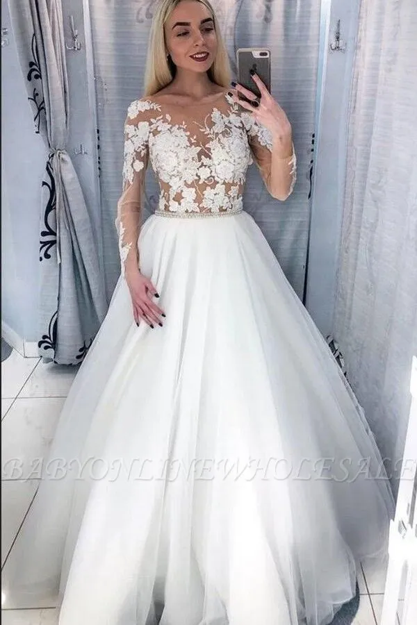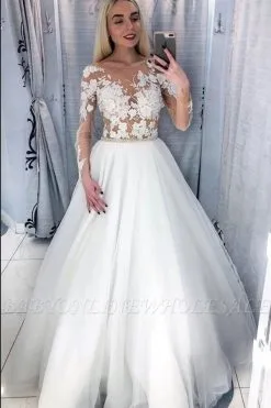 Looking for in Tulle, A-line style, and elegant Lace,Ruffles work? Babyonlinewholesale has all covered on this unique Elegant Long Sleeves A-line Wedding Reception Dress with Floral Appliques.