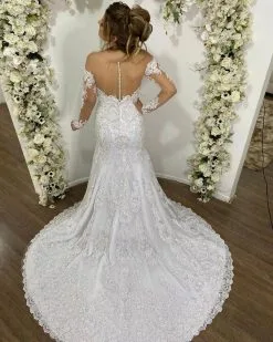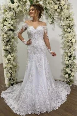Looking for in Lace, Mermaid style, and elegant Lace work? Babyonlinewholesale has all covered on this unique Elegant Long Sleeves Floral Tulle White Bridal Dress.