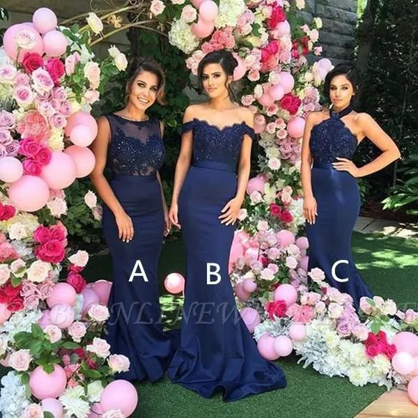 Sexy 3 Style Mermaid Bridesmaid Dresses, Long Satin Prom Dresses, Lace Applique Beaded Sweep Train Evening Dresses, Sheer Neck, Halter Neck, Off Shoulder Bridesmaid Dresses, Mermaid Formal Gowns