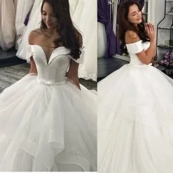 Be the first to review “Elegant Off Shoulder Ball Gown Puffy Layers Wedding Dress” Cancel reply
