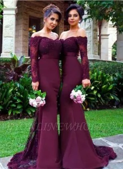 Babyonlinewholesale offers Elegant Off-the-shoulder Mermaid Lace-Appliques Beads Long-Sleeve Bridesmaid Dress at a cheap price from Same as Picture,White,Ivory,Blushing Pink,Candy Pink,Pearl Pink,Watermelon,Red,Fuchsia,Burgundy,Chocolate,Brown,Gold,Champagne,Orange,Daffodil,Regency,Grape,Lilac,Lavender,Sky Blue,Pool,Ocean Blue,Royal Blue,Ink Blue,Dark Navy,Black,Silver,Dark Green,Jade,Lime Green,Green,Sage, to Mermaid them. Stunning yet affordable Long Sleeves .