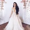 A-Line Sleeveless V-neck Sweep Train Chiffon Beading Wedding Dresses