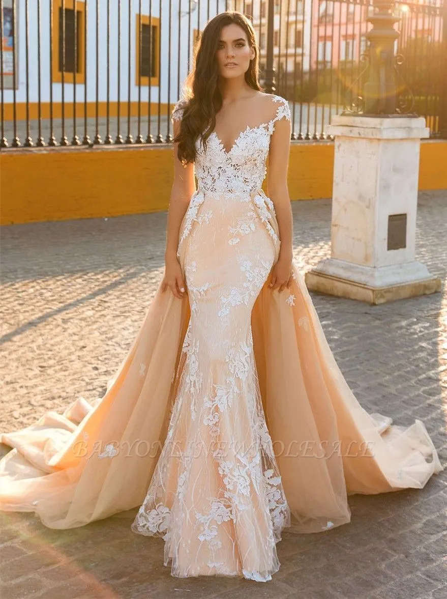 Looking for in , Mermaid style, and Gorgeous Lace work? Babyonlinewholesale has all covered on this elegant Elegant V-Neck Lace Applique Mermaid Bridal Gowns|2021 Cap SleeveWedding Dress with detachable Train.